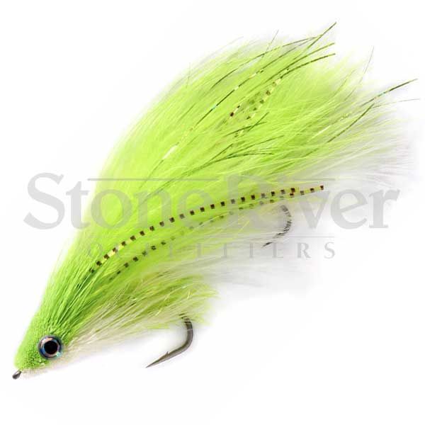 Finished fly measures approximately 3 to 4 inches long, and is dressed articulated on two razor sharp, stout-wire, wide gape hooks.