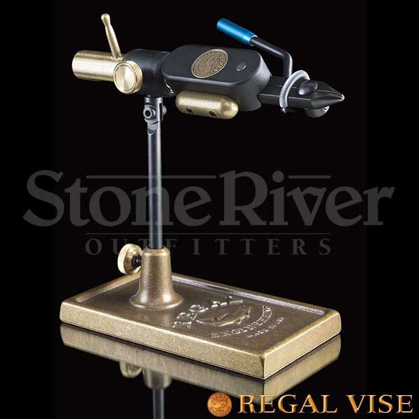 The most versatile and elegant vise ever produced, the Regal Revolution combines the bulldog hook holding power of their famous Medallion series heads together with silky-smooth, lightning-fast, true in-line rotary function! Incredibly popular with commercial fly tiers, the Regal Revolution incorporates their trademark compression style jaws that automatically adjust around hooks sized #22 thru #3/0, requiring no fine tuning or adjustment between changing flies. Simply squeeze the actuator lever, place the hook properly into the case-hardened jaws, gently release, and you're ready to tie! With a counter-balanced vise head that rotates 360 degrees, and a 240 degree adjustable pitch range too, the Revolution ensures tiers amazing access and versatility. A premier performer indeed, when nothing less than the very best will do, get yourself a Regal Revolution! Regal's 200-10 Revolution vise package includes Standard Rotary Jaws and your choice of Traditional 10T Bronze Logo or 10P Bronze Pocket Pedestal Base. Accessory parts sold separately.
